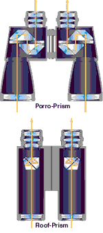 Porro-Prism Binoculars Each barrel of a porro-prism binocular contains two right-angle prisms. They are offset from each other, which requires that the objective lenses be spaced farther apart than the eyepieces. Thus, porro-prism binoculars are bulkier than their roof-prism counterparts. Optically, however, porro-prism binoculars usually perform better, because the prism design requires less strict tolerances. That makes them easier to manufacture, so they cost less. Also, porro prism binoculars yield a more stereoscopic, or three-dimensional, image. Roof-Prism Binoculars The prisms in a roof-prism binocular overlap closely, allowing the objective lenses to line up directly with the eyepieces. This results in a more streamlined, compact, and often more lightweight binocular than equivalent porro-prism models. But roof-prism binoculars are also more difficult to manufacture, so they cost more. Roof prisms lose slightly more light to reflection than porro prisms ? a disadvantage for astronomical use but not a concern for daytime terrestrial viewing. Well-made roof-prism binoculars can provide optical performance nearly equal to, but not better than, porro-prism binoculars. |