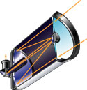 thickness of the lens means that the system only has a small amount of chromatic aberration. It also corrects the spherical aberration produced by the main mirror. The secondary mirror of the system is a metal coating vapour-deposited onto the back of the meniscus lens. So the design dispenses with spider vanes which could degrade the image. Due to the relatively small secondary mirror obstruction can be kept small. The optics provide very good contrast, coming close to that of a refractor. |