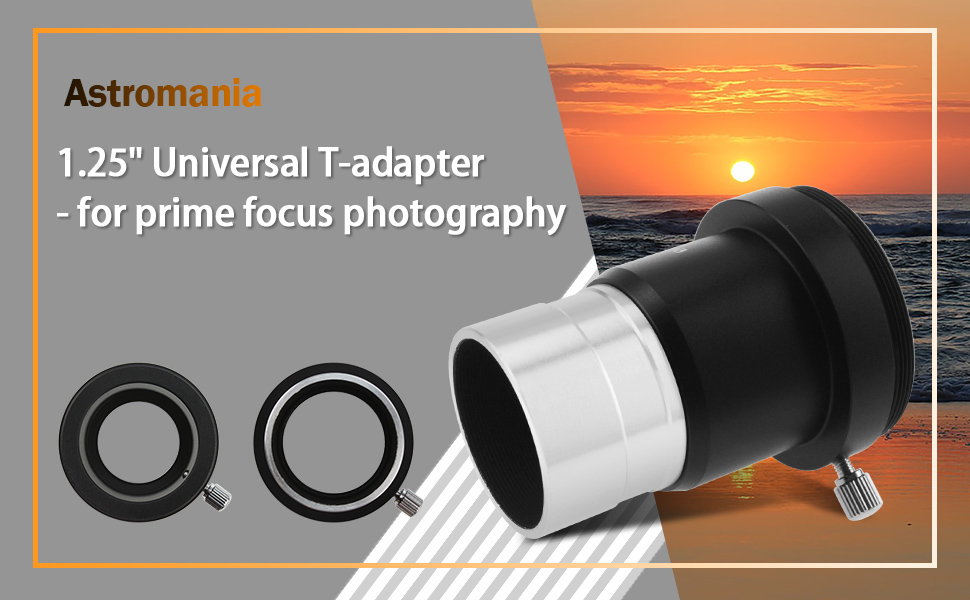 Astromania T-adapter for prime focus photography allows 35mm SLR cameras to be attached at the prime focus of your telescope. This lets you can take terrestrial photographs but also allows you to take lunar and planetary images. You will need an additional guide scope for deep sky astrophotography however.