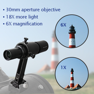 The Optics are the Key You cannot see most astronomical objects with your naked eye. Looking through the finder scope gives you 18X more light, allowing many astronomical objects to become visible to your eye. The 6x30 finder scope has a small 30mm aperture objective and 6X magnification - an extremely useful little telescope.