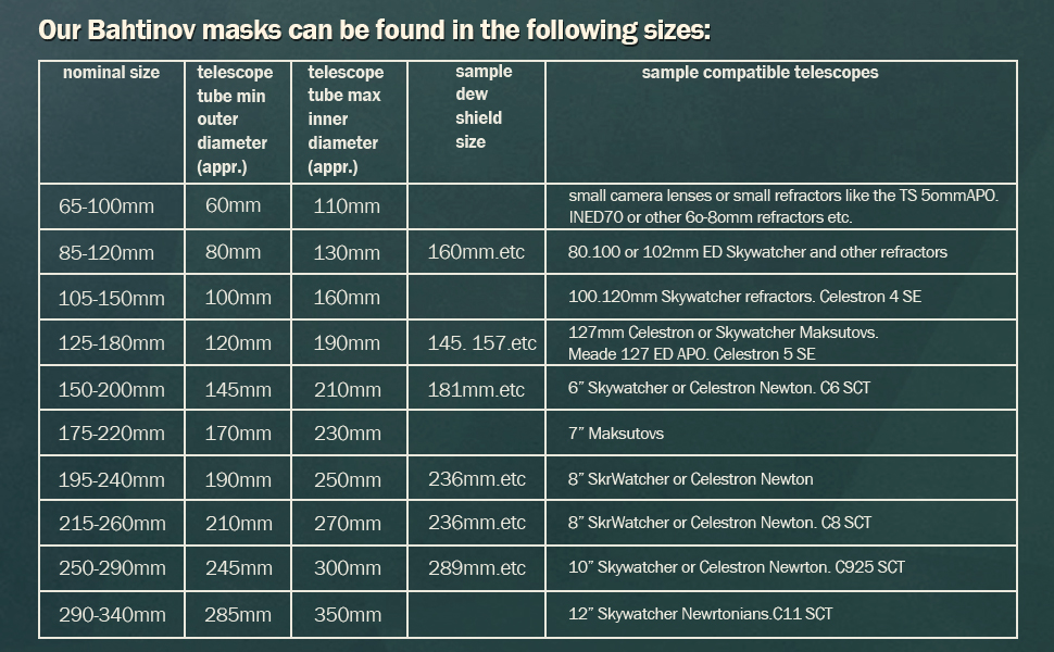 The masks grip the telescope tube gently but firmly with three metal posts which have non-scratching silicon sleeves to protect you valued telescope surface. This prevents slippage, whilst allowing the mask to remaining perfectly central. Because of this 3-post mounting, the mask remains centered, whilst fitting a wider range of telescopes.