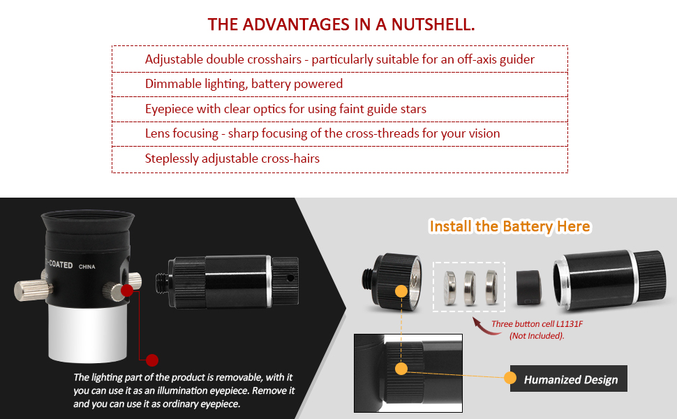 The Astromania crosshair eyepiece is ideally suited for guiding astrophotos when used in off-axis guiders or guide scopes. The extremely fine, illuminated double crosshairs make tracking the guide star much straightforward for you. Instead of having to cover the star, as with single crosshairs, you can keep it precisely positioned in the centre of the eyepiece. These eyepieces are also very useful for determining the field of view, aligning a mount, or for finding the position angles of double stars. |