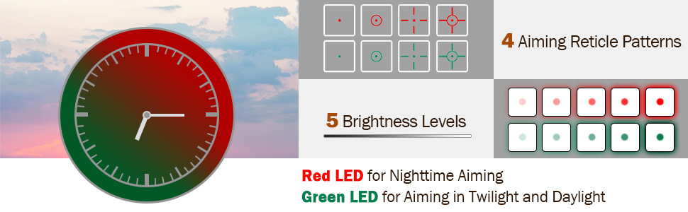 • four different light modes: point, circle with a red dot, cross-hairs, cross-hairs with circle