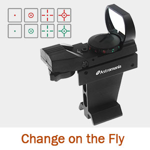 Four Different Light Symbols Choose between four different light symbols: dot, circle with a red dot, cross-hairs and cross-hairs with circle. This is very easy to change in the dark using the user-friendly switch at the back of the Astromania Finder Deluxe Telescope Reflex Sight .
